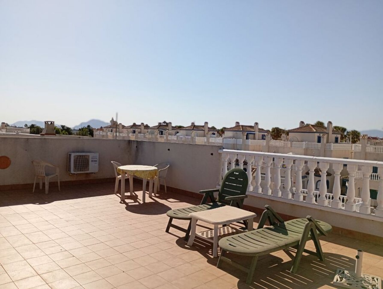 Diese überdurchschnittlich große Eckwohnung im ersten Stock befindet sich in einzigartiger Lage neben dem Gemeinschaftspool. Die Immobilie umfasst 2 Doppelzimmer, einen sehr großen Wohn-/Essbereich, eine offene Küche und ein komplettes Badezimmer. Terrassentüren führen auf die großzügige Terrasse, von der aus eine Außentreppe zum riesigen Solarium hinaufführt, wo Sie den ganzen Tag die Sonne genießen können, mit eingebautem Grill und herrlichem Blick auf die Umgebung.