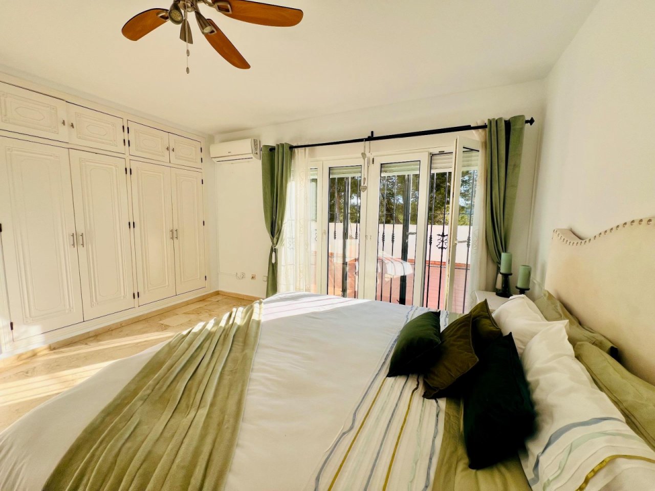 Obergeschoss: geräumiges Hauptschlafzimmer mit eigenem Bad und Zugang zu einer großen Terrasse mit freiem Blick.