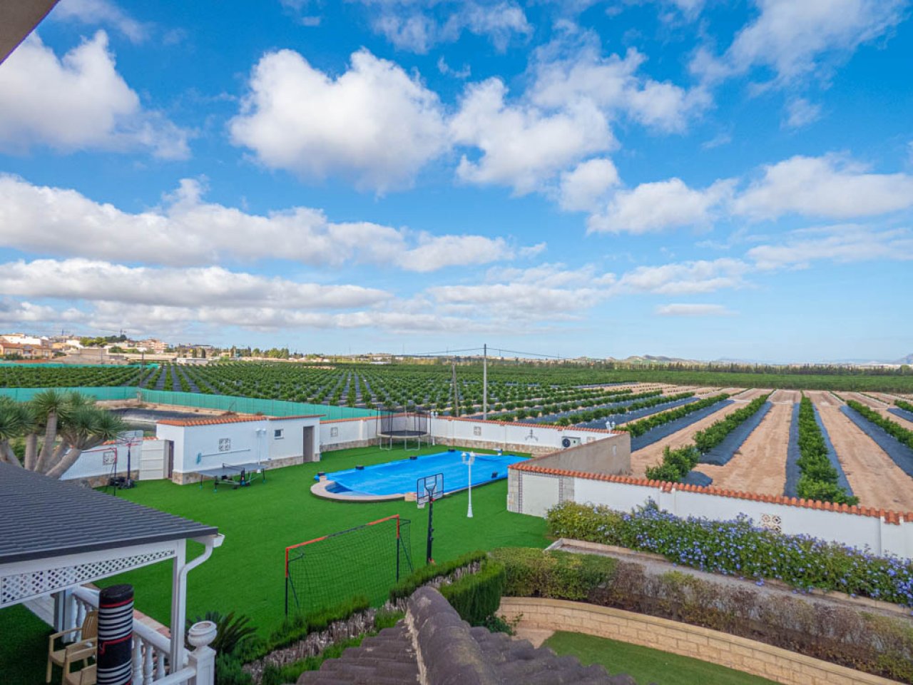 As you enter the villa you have a large hallway, at the far end you have stairs, providing access both up and down. Moving to your right you have a bedroom and a separate bathroom, then the main lounge/living area, with a beautiful ornate fireplace. Moving back and across you have a bedroom to your right and this is followed by an open plan kitchen and dining area, which provides ample room to talk to friends while cooking. Next you have a snooker room which has a full-length professional snooker table, with ample room to move and play your shot, from here you have another bathroom followed by the next bedroom, lastly on this level you have a utility room. If we then move to the hallway and upstairs, the stairs has a stairlift if needed, which takes you up to the first-floor landing, to your left you have access out to an upper terrace, with views over the countryside, but also offers an office. Moving back inside to your left you have the master bedroom, which is a generous size and benefits from a walk-through wardrobe and its own private en-suite. If you walk back towards the landing there is a corridor that provides access to all the other rooms on this level, such as three more bedrooms and two more bathrooms. Taking the stairs down and through the kitchen and out you have a lower terrace that overlooks the pool, to the left of this area is another bathroom. Finally on the lower level you have the garage, which has two separate doors providing ample space for two cars plus lots of storage, plus another bathroom.