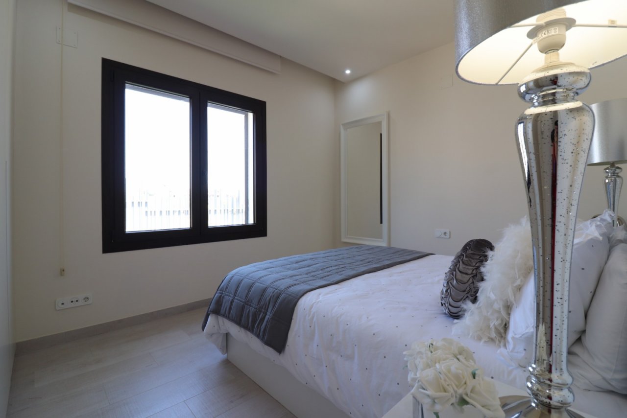 Built in 2017, this stunning 127m² villa boasts beautiful contemporary design and high-quality finishes throughout. The open-plan living space is bright and spacious, with a vaulted beamed ceiling in the lounge and large sliding glazed doors that flood the area with natural light. The dining area leads into a sleek, modern fitted kitchen with a breakfast bar and separate utility room. There are three double bedrooms, all with built-in wardrobes, including a master bedroom with access to a private terrace and an en suite shower room. A stylish family shower room completes the interior. Situated on a generous 448m² low-maintenance plot, the exterior features a partly covered terrace, artificial grass area, off-road parking, a carport. The villa also benefits from air conditioning, an irrigation system and access to two beautiful communal pools. A truly exceptional home in one of the most sought-after locations on the Costa Blanca South.