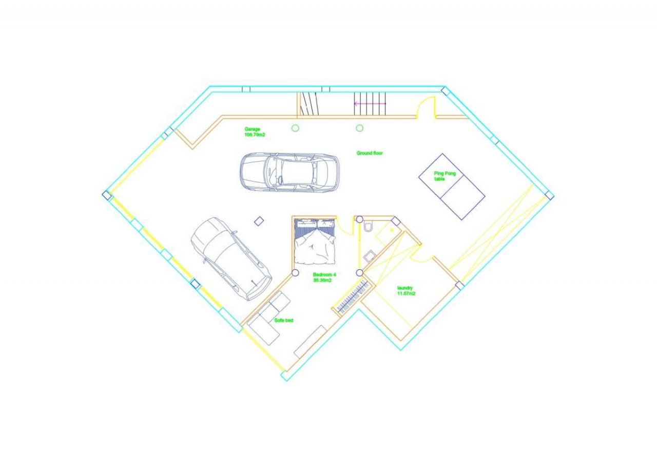 The 156 m² basement level features a guest studio with access to the garden and an en-suite bathroom, as well as a spacious garage, laundry area, storage rooms, and ample space for a gym and/or games room.