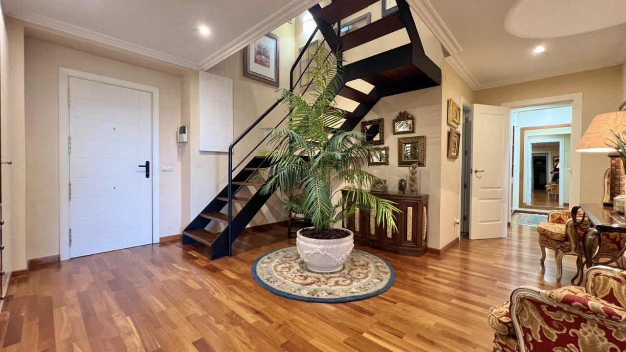In an attractive location in Denia, this exceptional duplex penthouse is a real highlight for discerning buyers. Spacious rooms, high-quality materials and several large terraces – topped off by a private pool on the roof terrace – make this property a rare opportunity. Upon entering, you are immediately impressed by the stylish entrance hall with its open staircase and warm cherry wood floors, which continue throughout the entire living area. The bright living and dining area offers an elegant atmosphere with direct access to the spacious main terrace. Large sliding elements provide plenty of daylight and create a flowing transition between the interior and exterior. The separate, fully equipped kitchen impresses with its size, ample work surface and high-quality fittings – ideal for families or passionate amateur chefs. The penthouse has 4 spacious bedrooms, 3 stylish bathrooms, a guest WC and an additional living room/study on the upper level.…
