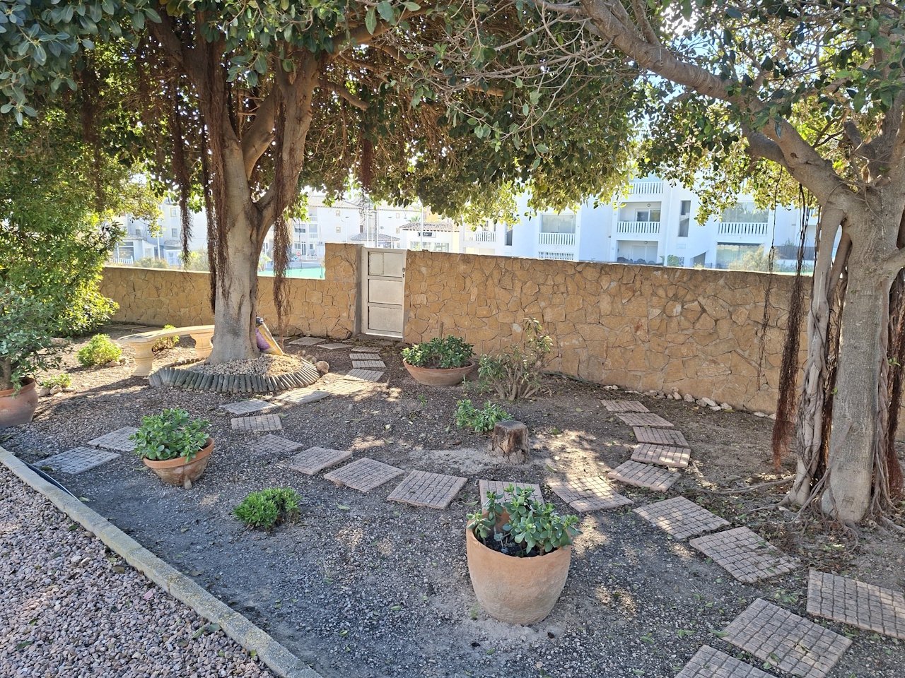 Both houses are located on the smaller plot of approximately 2,621 m², which is beautifully landscaped with many palm trees and other Mediterranean plants. The larger plot was previously used as a parking area for motorhomes and offers many possibilities for development.