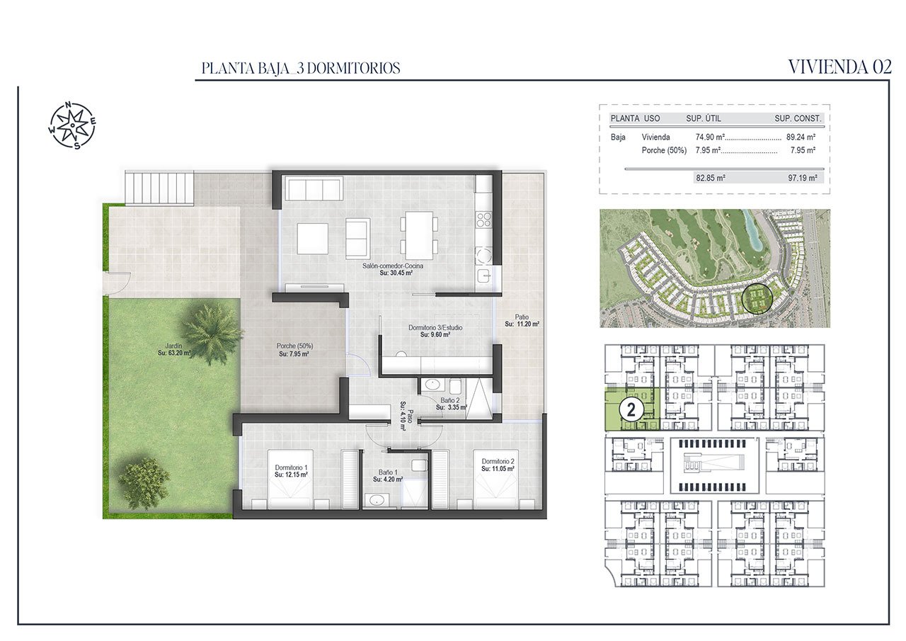 Los bungalows disponen de 2 ó 3 dormitorios y 2 baños en plantas bajas o en plantas altas. Las plantas bajas disponen de un jardín frontal además de un patio trasero. Algunos bungalows en planta baja incluyen también zona de aparcamiento en su jardín privado. Las plantas altas disfrutan de una porche y un gran solárium.