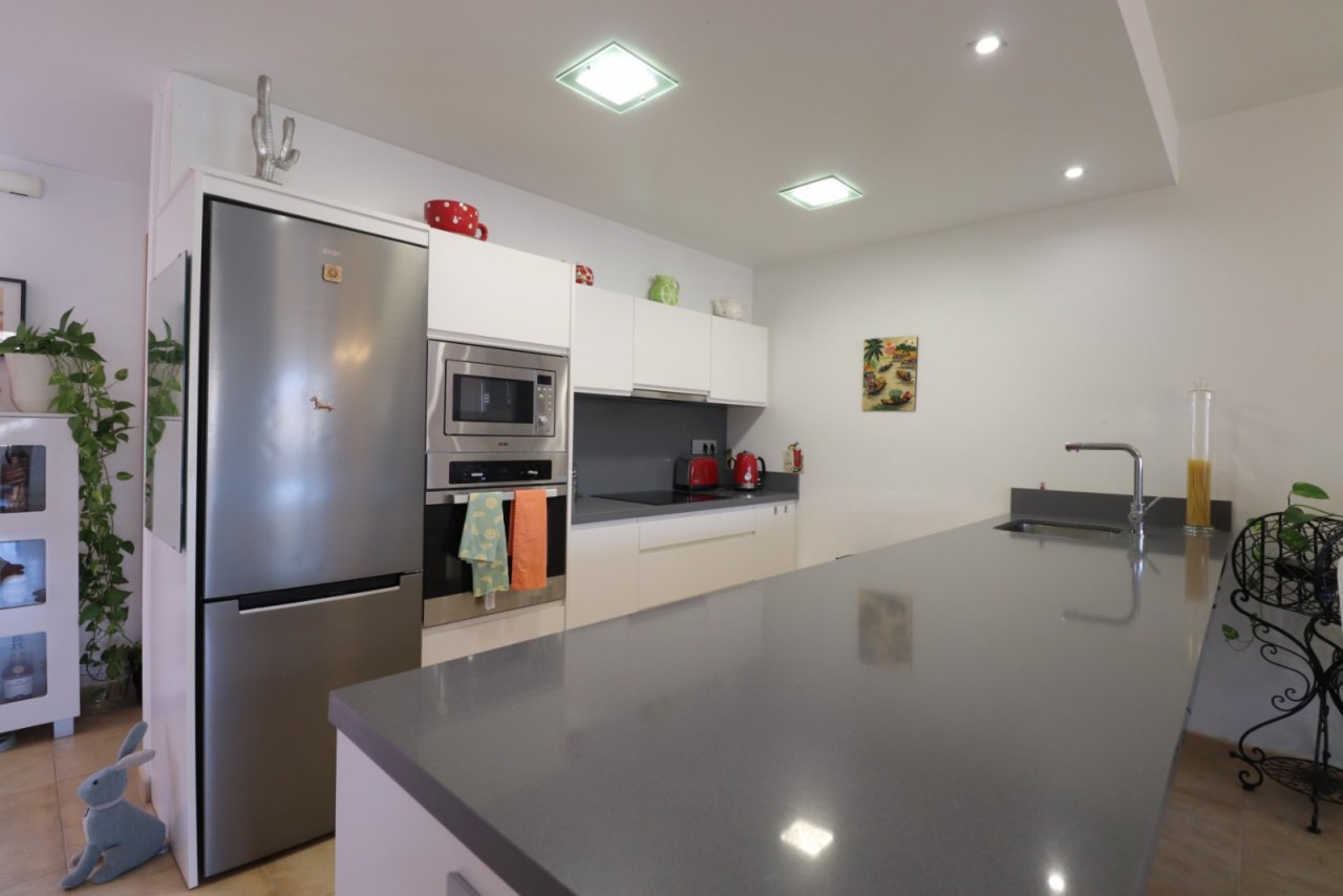 Distribuida en tres plantas y con una elegante distribución, esta espaciosa casa de 116 m² cuenta con un salón diáfano con puertas acristaladas que dan a una terraza parcialmente cubierta con vistas a la piscina comunitaria. La moderna cocina equipada es elegante y funcional, y también hay un práctico aseo en la planta principal. Unas escaleras conducen tanto a la primera planta como al amplio garaje subterráneo. En la planta superior, la primera planta ofrece tres dormitorios dobles, todos con armarios empotrados. Dos de los dormitorios tienen acceso a terrazas privadas, una de ellas con vistas a las montañas, y hay dos elegantes baños con ducha, uno de ellos en suite en el dormitorio principal. En el exterior hay un jardín embaldosado de fácil mantenimiento, y al garaje de 58 m² se accede mediante una entrada segura y cerrada. Los extras incluyen aire acondicionado.