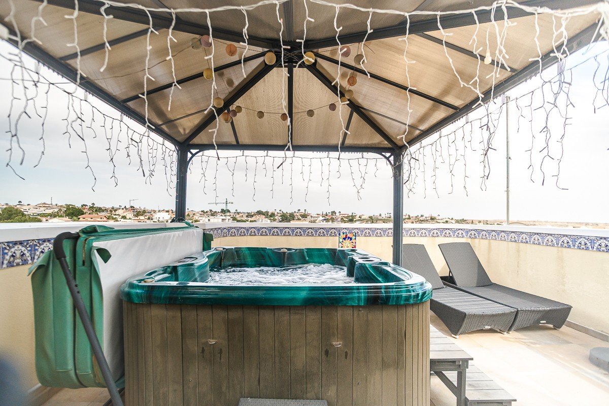 Como broche de oro, la villa cuenta con una espaciosa terraza en la azotea con pérgola, cocina de verano y jacuzzi: el lugar perfecto para disfrutar del estilo de vida mediterráneo y de las vistas al mar.