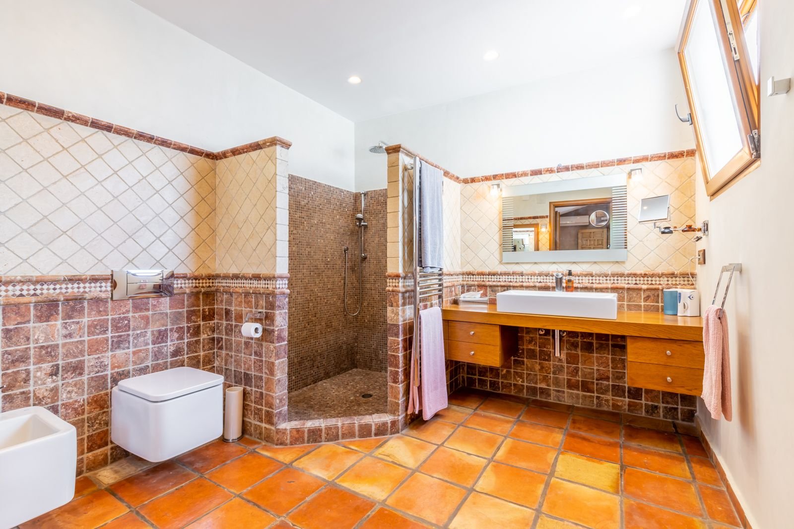 La maison principale dispose de 4 grandes chambres, 3 salles de bains en suite et des toilettes invités, réparties de manière fonctionnelle avec une attention particulière portée aux détails. Les matériaux nobles tels que les poutres en bois, les sols en terre cuite, la pierre tosca emblématique et le chauffage au sol apportent chaleur, élégance et caractère méditerranéen à chaque espace.