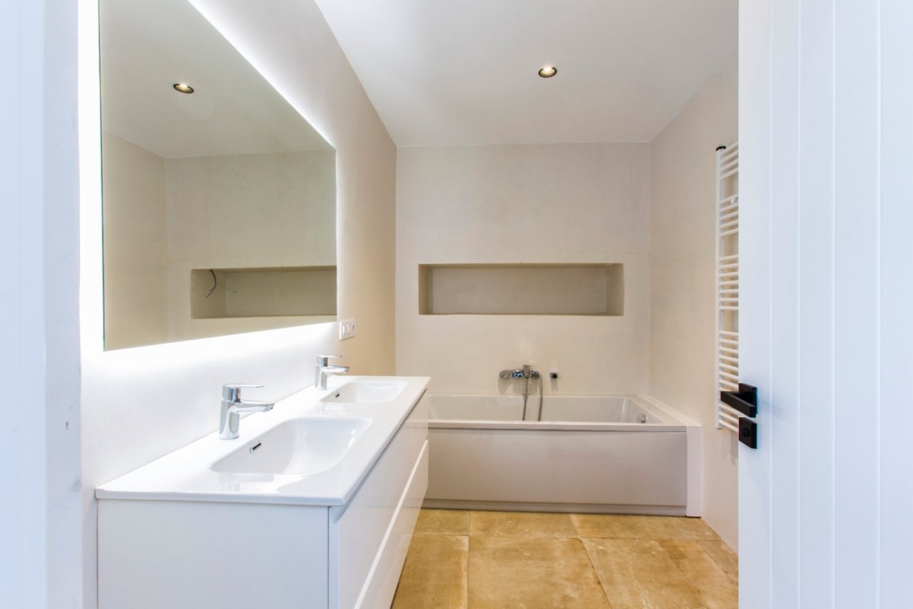 Un élégant escalier intérieur mène à l'étage inférieur qui comprend une cuisine ouverte équipée lumineuse avec un bar (qui peut être utilisé à l'intérieur comme à l'extérieur), un accès direct à la terrasse et deux autres chambres avec des armoires encastrées élégantes et des salles de bains attenantes. L'une d'entre elles offre un accès direct à la grande terrasse ensoleillée et l'autre à une terrasse privée à l'arrière de la maison. De plus, il y a des toilettes pour les invités ainsi qu'une buanderie.