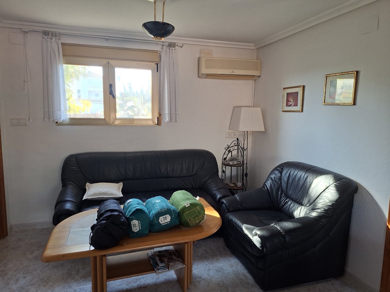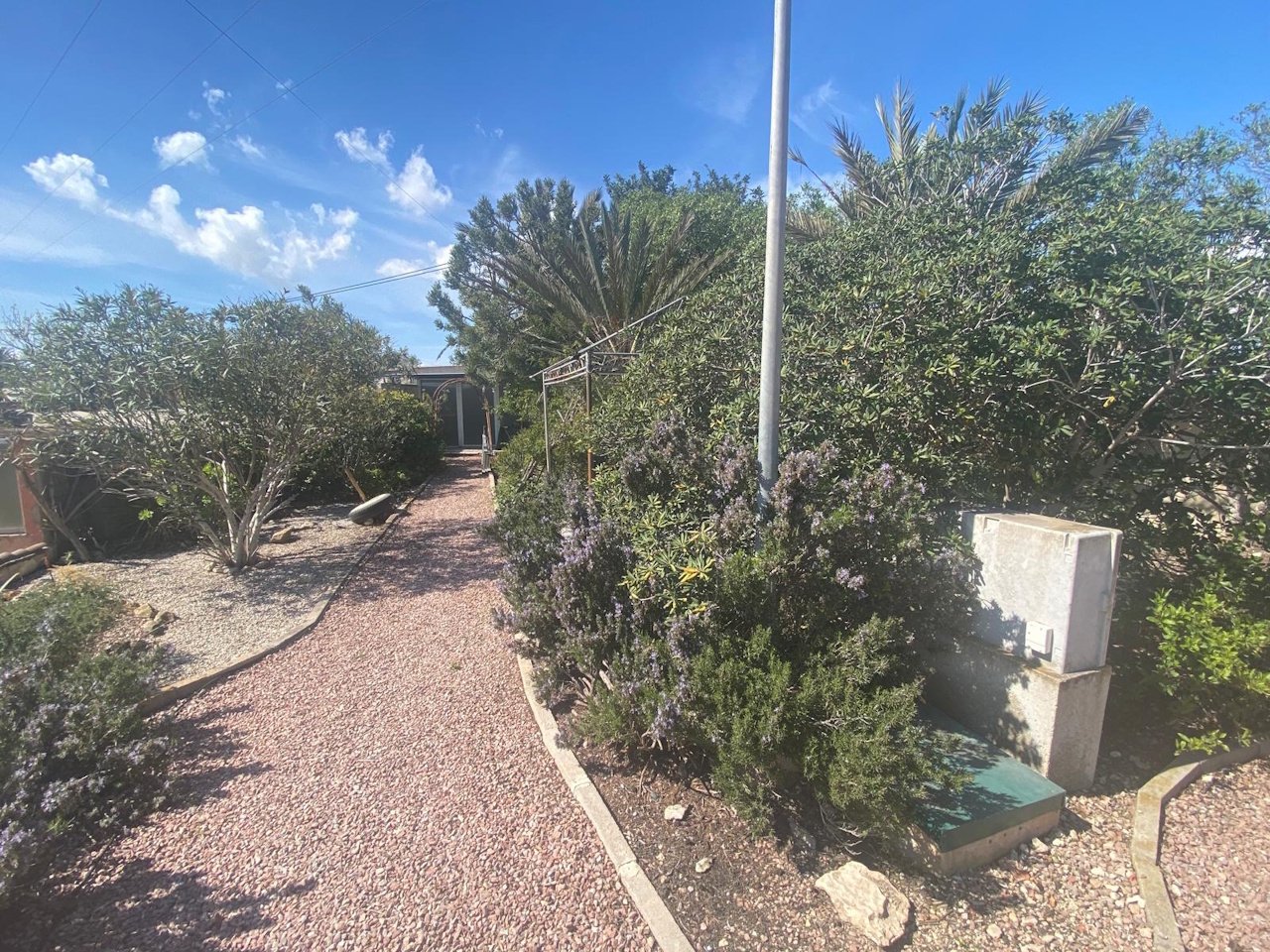 Les deux maisons sont situées sur le plus petit terrain d’environ 2 621 m², joliment aménagé avec de nombreux palmiers et d’autres plantes méditerranéennes. Le terrain plus grand était auparavant utilisé comme espace de stationnement pour des camping-cars et offre de nombreuses possibilités d’aménagement.